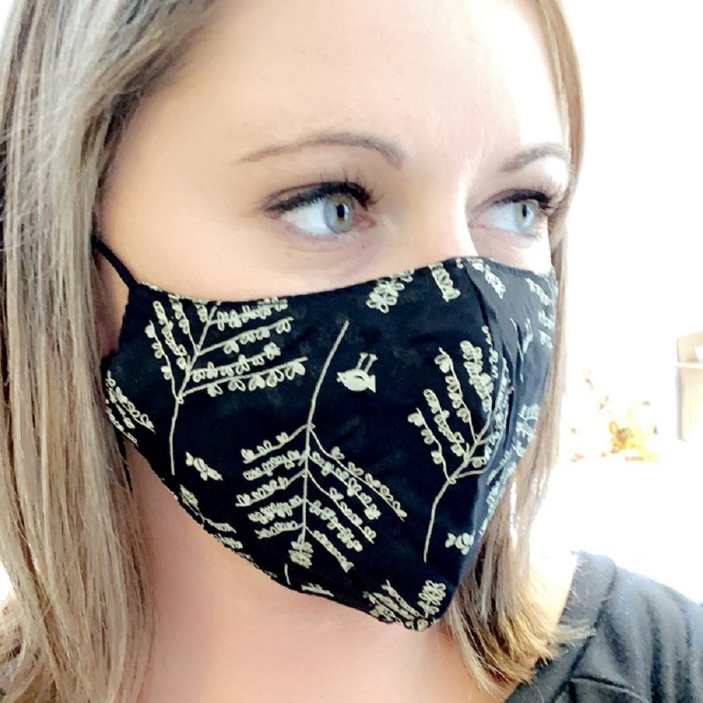 This mask has a delicate tree pattern on it to add just the right cuteness! Nice and comfortable with adjustable straps. It is a cotton/poly blend. It also is equipped with a filter pocket.